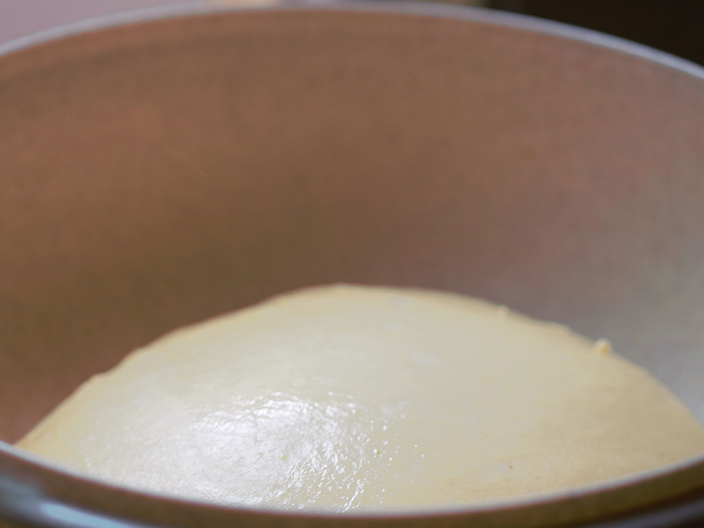 Una vez que tu masa esté lista, pon un poco de aceite de oliva en un recipiente, y coloca la masa. Dale una vuelta para que quede engrasada la masa y cúbrela con papel plástico adherente. Déjala reposar hasta que triplique su tamaño (dos horas, dos horas y media).
