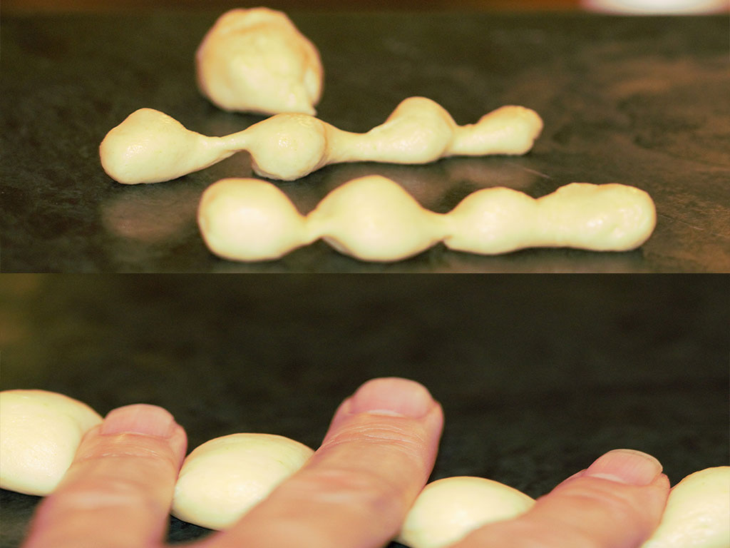 Bolea cinco piezas y colócalas sobre una charola engrasada o con papel estrella. Aplasta cada pieza con la mano y tápalas con un paño, mientras elaboras los huesos y cráneos.